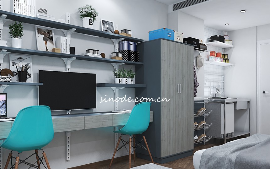 现代精致人才公寓基材:采用E0级实木颗粒板/实木多层板贴三聚氰胺饰面;优质绿色环保产品,甲醛含量≤0.5mg/L,密度≥760kg/m3,静曲张度≥51.2Mpa,吸水膨胀率≤8.1%; 封边:采用2mm厚PVC胶边,进口热熔胶; 配件:优质三合一、门铰、导轨等五金配件; 功能特点: ①可按色板选择不同的色彩、纹路(直纹和山纹); ②按不同的用途选择12mm、16mm、18mm、25mm等厚度; ③具有防水、防烫、防污、防酸、防碱特点; |