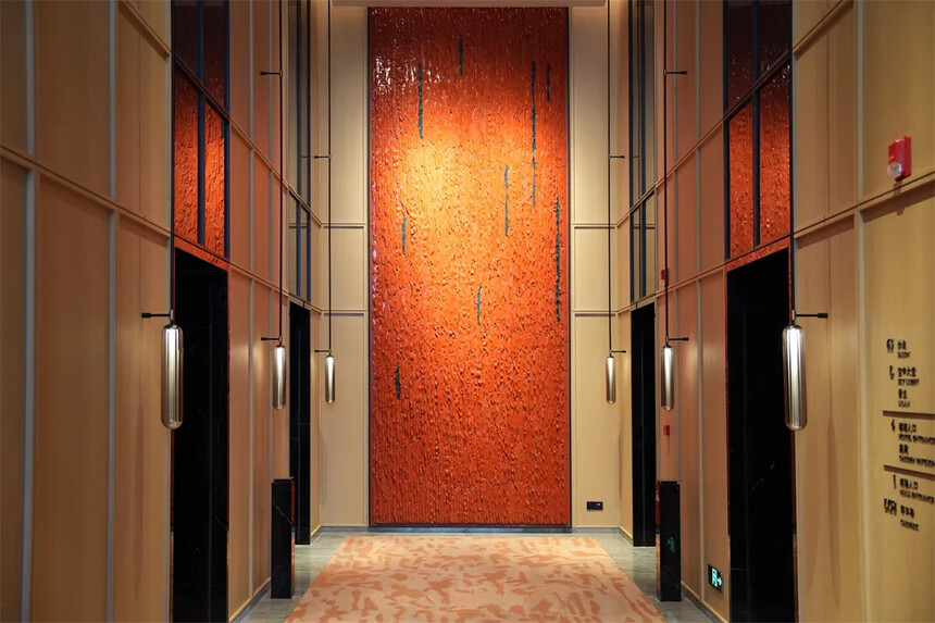 抵达大厅,一副金丝铜线交织而成的艺术挂饰,其灵感来自于湖南湘绣,